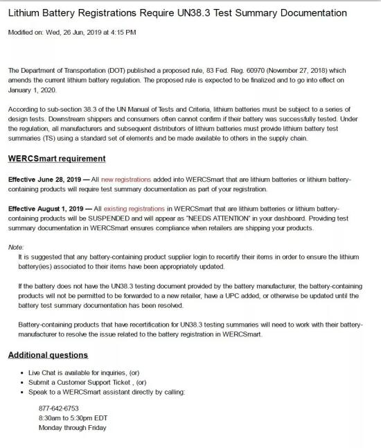 一、所有最新注册的锂电池产品或者包含锂电池的产品,都需要上传电池UN38.3测试报告,此规定于2019年6月28日生效!