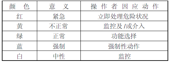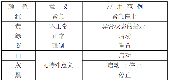 4) 按钮颜色应当满足下表要求,启动按钮颜色白灰黑绿,推荐白,停止按钮黑灰白,推荐黑色,可以红色但是不建议挨着急停按钮。复位按钮应当蓝白灰黑。若多个按钮用的同一个颜色,辅助措施如图形形状位置等
