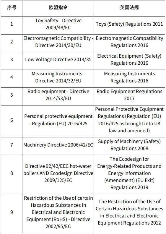 现阶段,英国法规对应的欧盟指令如表 1,英国法规对产品范围、标准、合格评定程序等的要求与欧盟指令基本一致。然而,英国相关法规会不定期更新,如序号8的《2019年能源相关产品生态设计和能源信息(修订)法规》已修改相关术语及表述、增加退出欧盟过渡期条款等,为使用UKCA标志做准备。